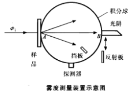 霧度和透光率是透明薄膜材料兩項(xiàng)重要的指標(biāo)。霧度(也稱朦朧度)H還是入射光透過樣品后偏離入射方向一定角度以上的漫透射通量與總透射通量的比值。霧度常用于描述透明薄膜材料的漫射特性。對(duì)漫透射光偏離入射光的角度一般規(guī)定為大于2.5,但是也有規(guī)定為其他角度的。ASTM D1003中對(duì)有關(guān)霧度測(cè)定、顯示方法做了詳細(xì)規(guī)定。